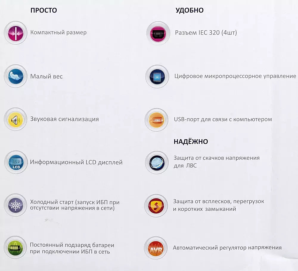 • Индикация состояния Режим работы от сети/батарей, индикация неисправности, звуковая индицкация режимов работы