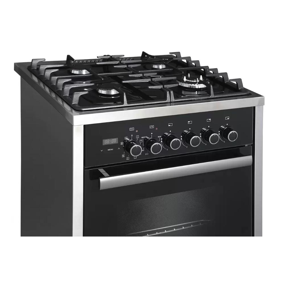 В данной модели установлена газовая варочная поверхность — эффективный нагрев, специальные механизмы для защиты вас от ожогов, плавная регулировка мощности. Стандартное количество конфорок — 4 штуки — подходит большинству пользователей. Панель выполнена из закаленного стекла, которое обеспечивает надежность и долгий срок службы; за ней необходимо тщательно ухаживать.