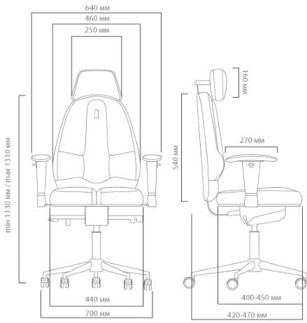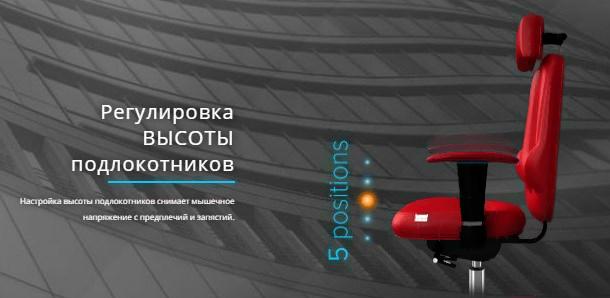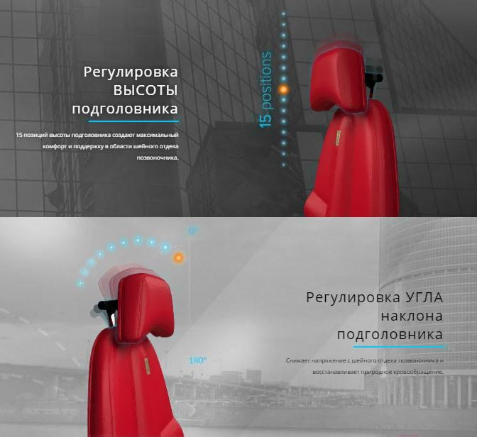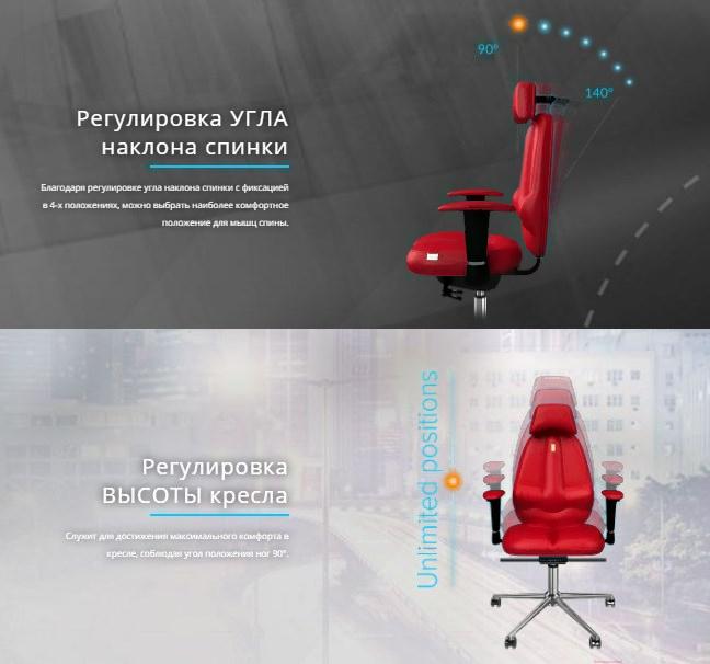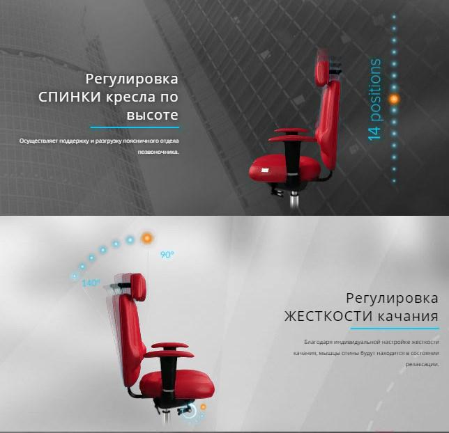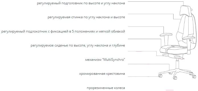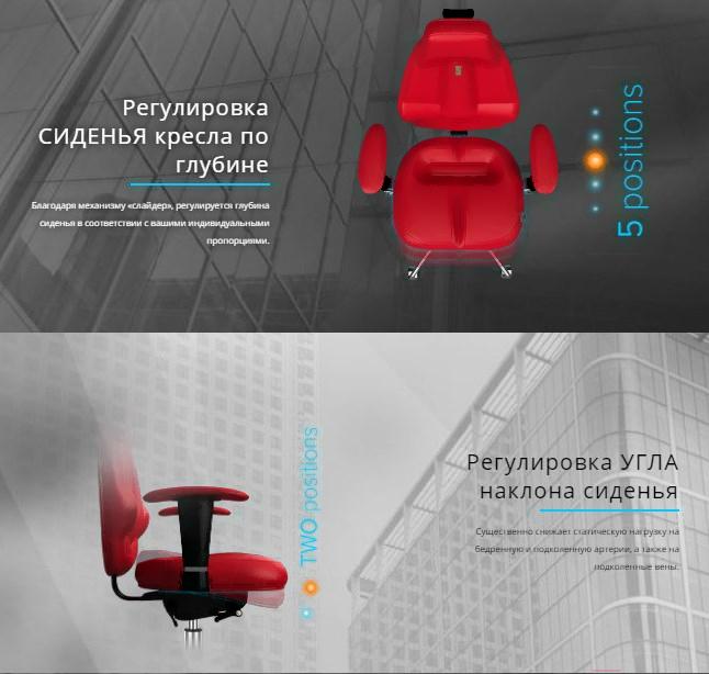 Регулировкавысота сиденья, высота спинки, наклон спинки, высота подлокотников ( с фиксацией в 5 положениях), высота подголовника, наклон подголовника, глубина сиденья, наклон сиденья
