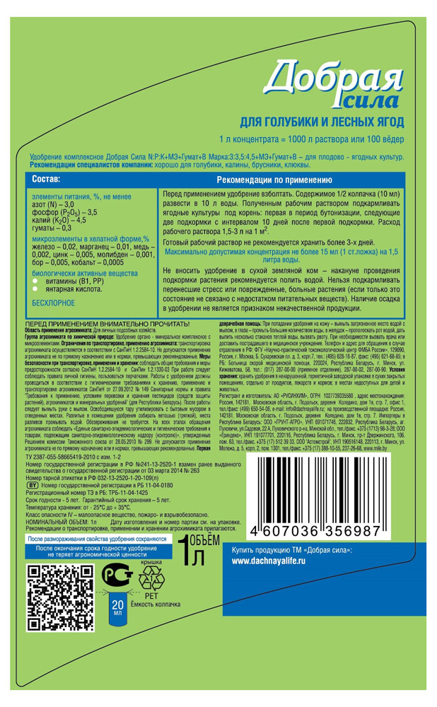 Удобрение для голубики и лесных ягод «Добрая сила» органо-минеральное , 1 л