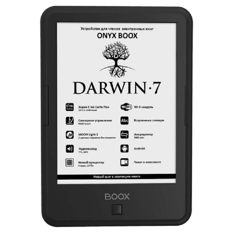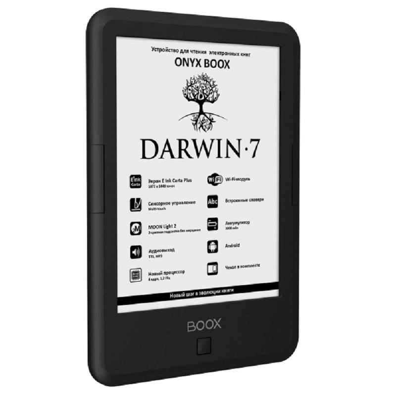 ONYX BOOX Darwin 7 — это устройство для чтения электронных книг с экраном последнего поколения E Ink Carta Plus, имеющим самые высокие разрешение и контрастность, функцией SNOW Field и встроенной системой подсветки MOON Light 2 с регулировкой цветовой температуры и отсутствием мерцания. Ридер имеет выдающиеся технические характеристики: высокопроизводительный4-ядерный процессор, 1 ГБ оперативной и 8 ГБ встроенной памяти. Интегрированный модуль Wi-Fi и сенсорное управление в сочетании с полноценным браузером позволяют использовать устройство для серфинга в сети Интернет. Благодаря наличию стандартного аудиовыхода имеется возможность прослушивать на ридере музыку и аудиокниги. Возможности встроенного программного обеспечения позволяют настраивать практически любые параметры текста, по желанию пользователя. А операционная система Android даёт возможность устанавливать сторонние программы для чтения