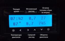 Основные функциивремя в поездке, измерение моментальной скорости, измерение средней скорости в пути, измерение среднего расхода топлива, массовый расход воздуха, напряжение бортовой сети, обороты двигателя, остаток топлива, положение дроссельной заслонки, поправка угла опережения зажигания, пробег за поездку, прогноз пробега на остатке топлива, расход в час, сброс ошибок, средний расход в час за поездку, средний расход на 100 км за поездку, стоимость поездки, считывание/расшифровка кодов неисправностей, температура воздуха, температура охлаждающей жидкости двигателя, часы/календарь