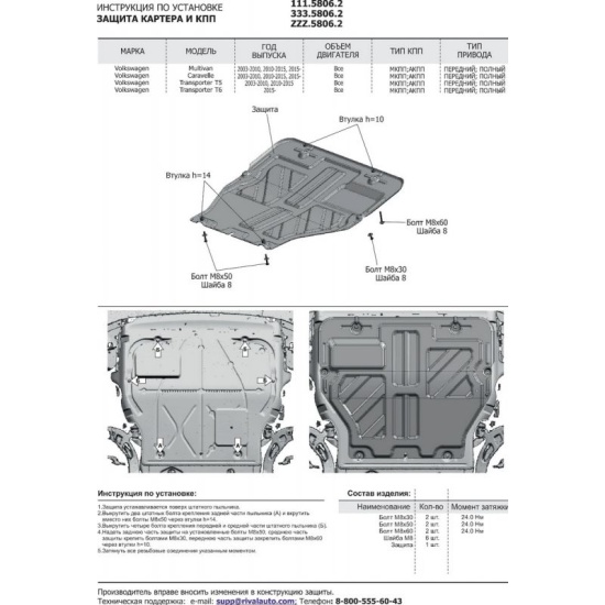 Защита картера и КПП RIVAL для Volkswagen Caravelle T5, T6 (2003-н.в.)/Multivan T5, T6 (2003-н.в.)/Transporter T5, T6 (2003-н.в.), штампованная, алюминий 3мм 333.5806.2