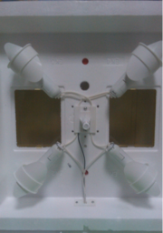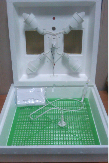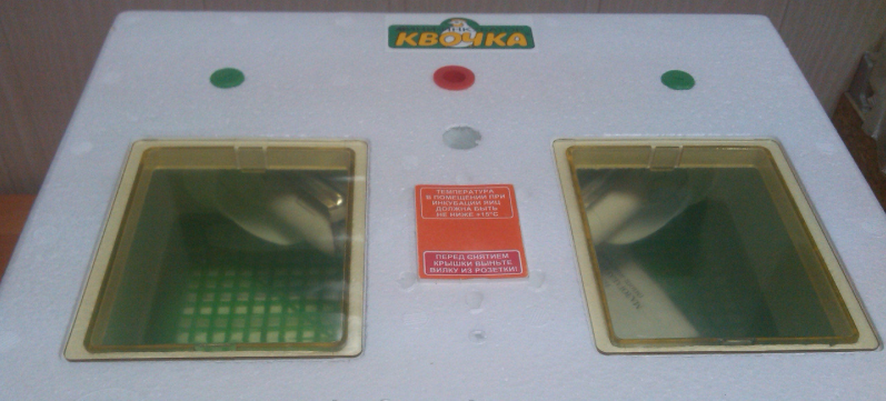 Внизу устройства имеются два водяных резервуара. Они, а также 8 вентиляционных отверстий обеспечивают вентиляцию и необходимую влажность воздуха. В крышке прибора находятся 2 обзорных окошка, предназначенных для визуального контроля за процессом инкубации. Внутри крышки расположены нагревательные лампы, прикрытые отражателями, и терморегулятор.