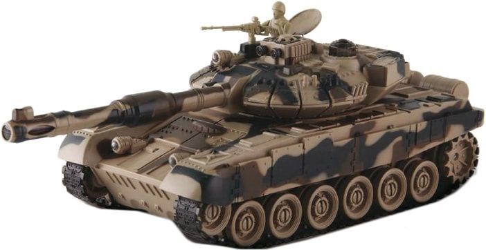 Тип: радиоуправляемая игрушка. Вид: танк. Материал: пластик, металл. Назначение: для мальчиков. Максимальная скорость 6 км/ч. Питание: батарейки AA. Тип дистанционного управления: радиосвязь. Управление: дистанционное. Цвет: коричневый. Танк осуществляет движение вперёд/назад, повороты вправо/влево, подъёмы под углом 45°, круговое вращение на месте и поворот башни вправо/влево на 320°.