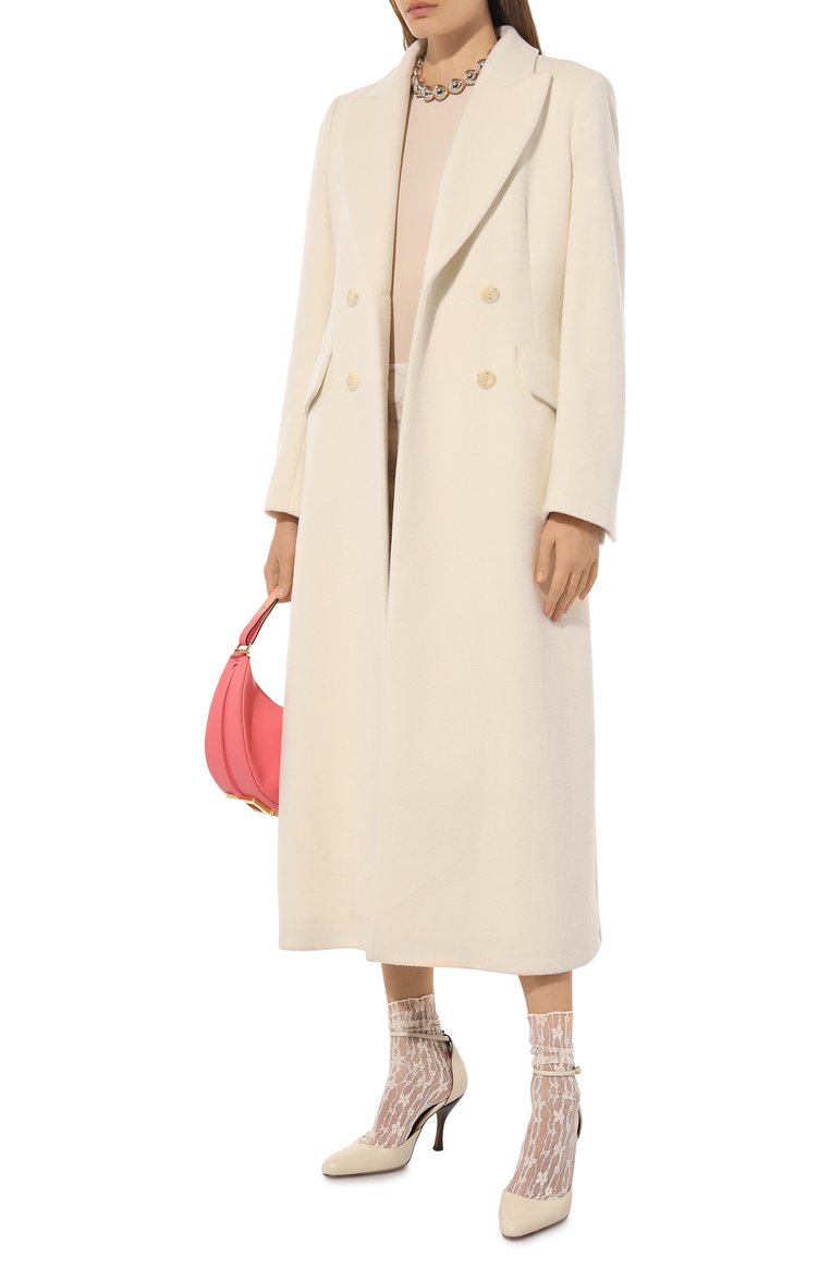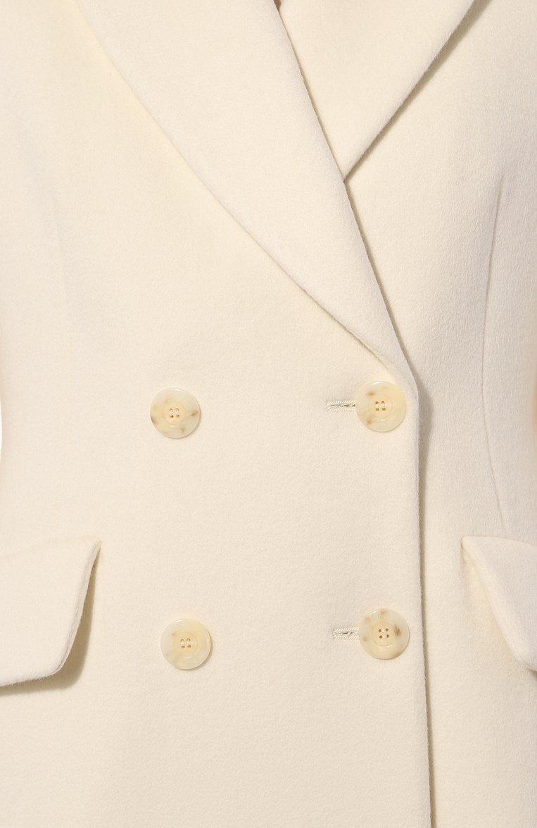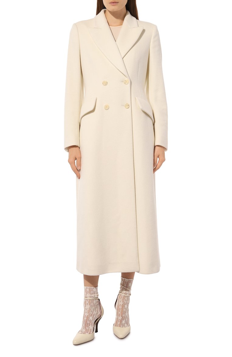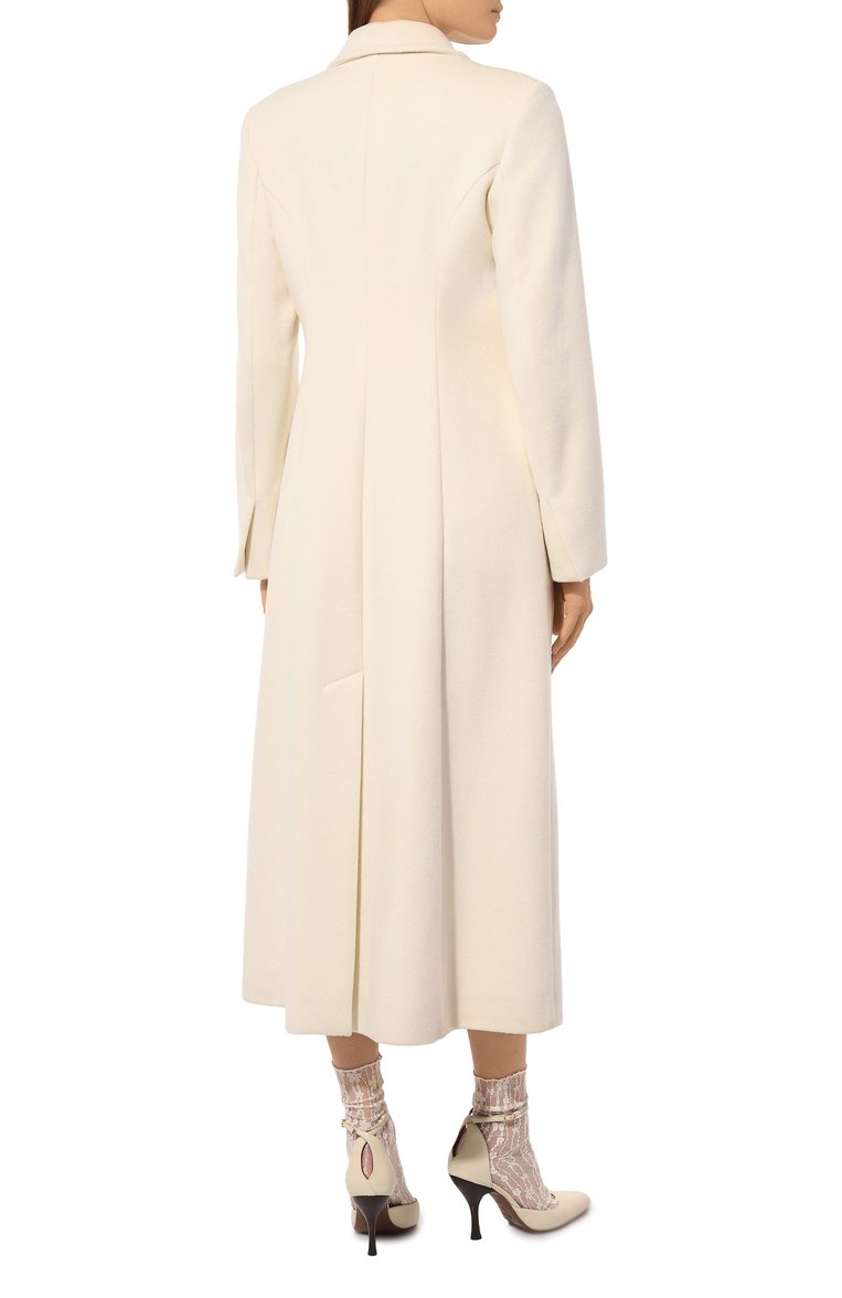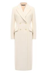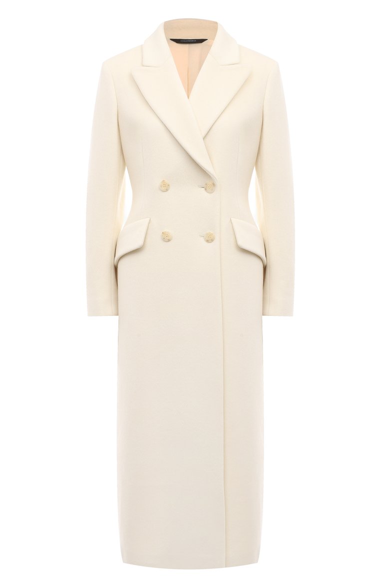 Для пошива приталенного пальто выбрали чистый кашемир, а для изготовления подкладки – ацетат с добавлением шелка. Двубортная модель с широкими лацканами, высокой шлицей и складками сзади дополнена боковыми карманами с клапанами.