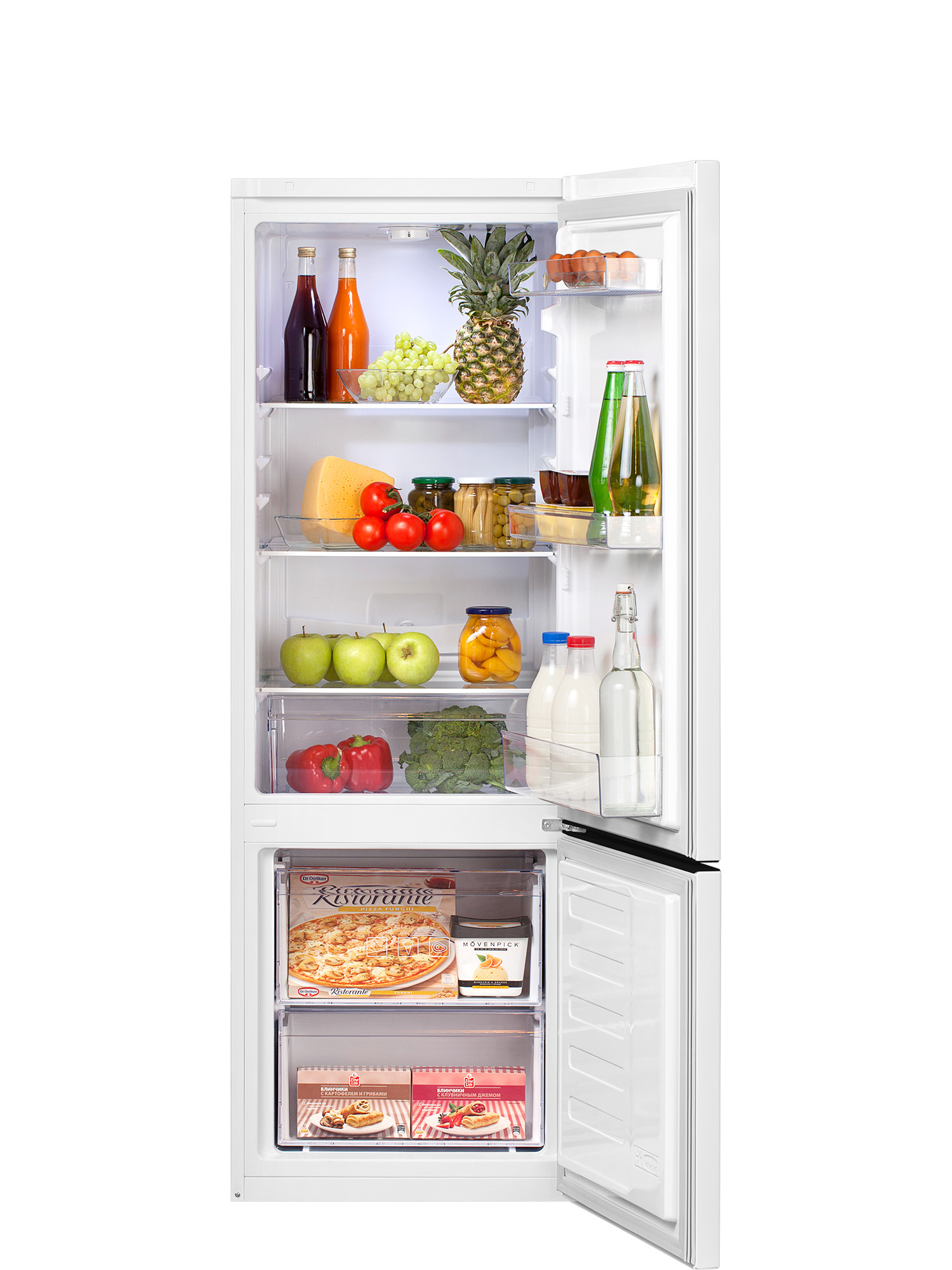 Белый двухкамерный холодильник с нижней морозильной камерой и статической системой охлаждения. Холодильник имеет общий объем 250 л и оснащен тремя регулируемыми стеклянными полками в холодильной и двумя большими прозрачными ящиками в морозильной камерах. Холодильнику присвоен класс энергоэффективности А. При отключении электричества холодильник сохраняет холод внутри в течение 16 часов.