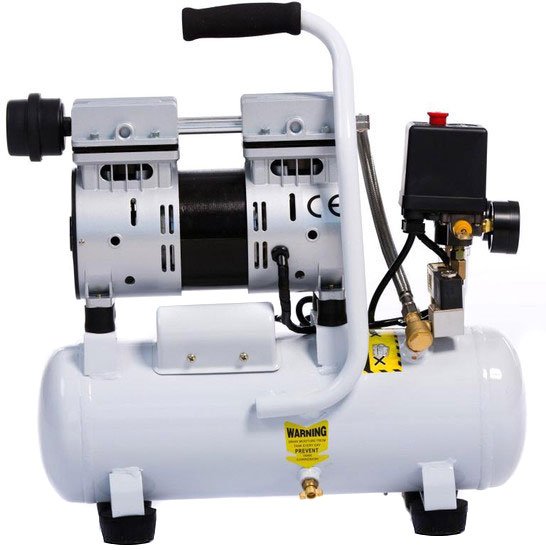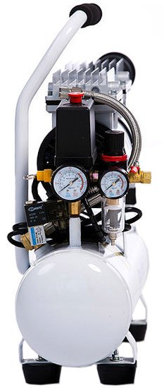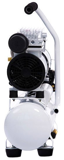 Поршневой компрессор; мощность 0,55 кВт; прямой привод; объем ресивера 9 л; производительность 120 л/мин; напряжение 220; количество цилиндров 2; безмасляный; передвижной; вес 16 кг.