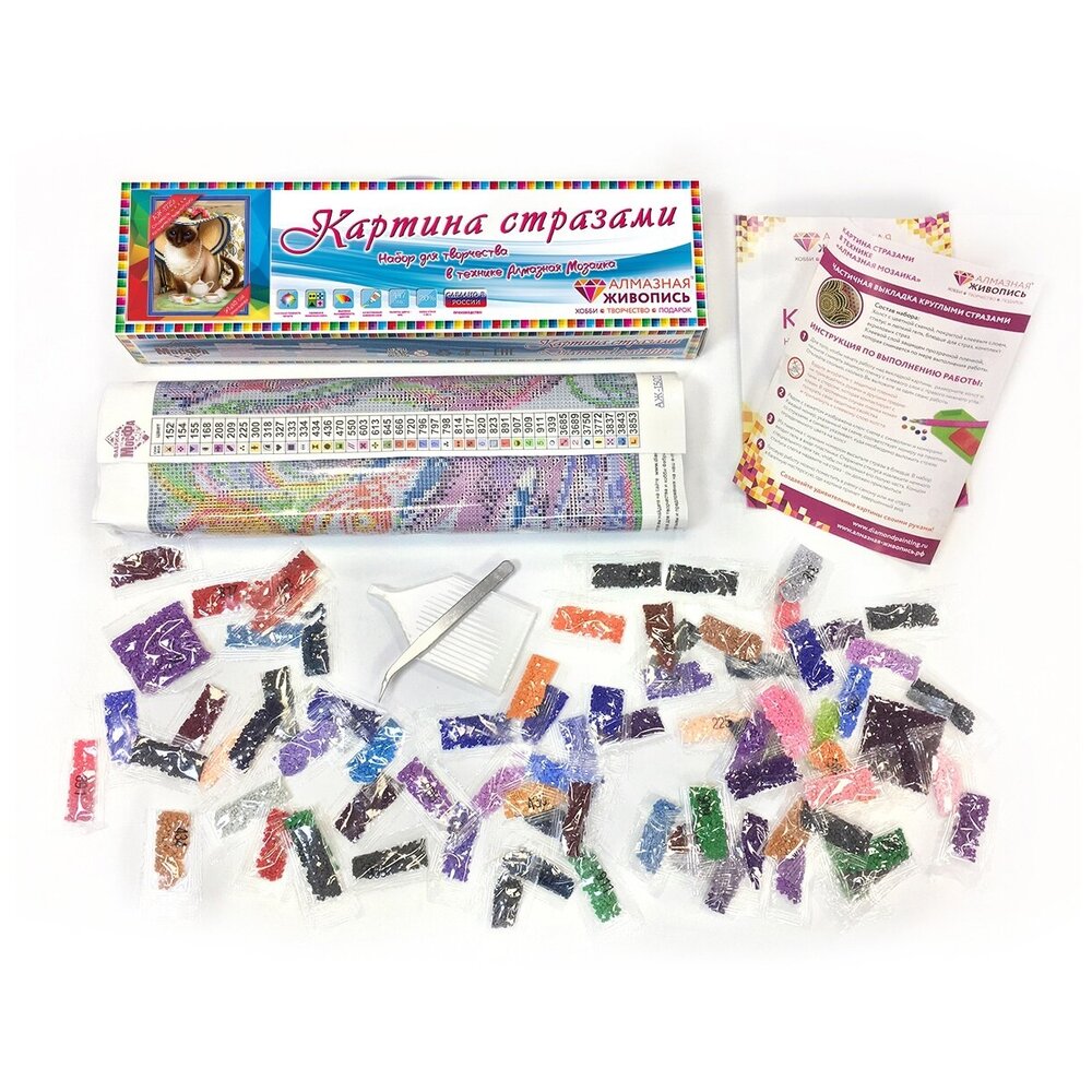 Элементы мозаики представляют собой акриловые стразы размером 2,5 х 2,5 мм. Поверхность страз имеет 9 граней, которые очень эффектно отражают свет. Состав набора: Холст с цветной схемой и клеевой основой<br />Пинцет или стилус Лоток для страз Комплект квадратных страз<br />Инструкция по работе. Размер готовой работы, см: 30х40. Число цветов, шт: 38. Уровень сложности набора: 4*. Тип страз: квадратные. Тип выкладки: полная.<br />Все, что нужно — уже в коробке. Просто выберите любимый сюжет и приступай-те к творчеству!.