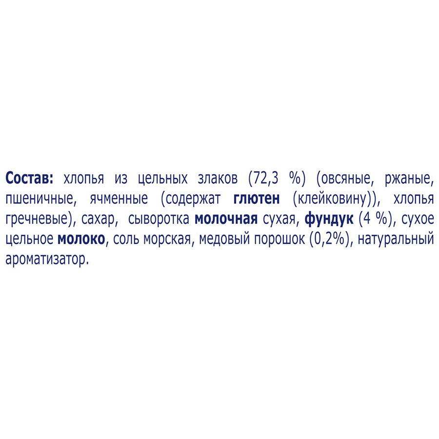 - Состав хлопья (овсяные, ржаные, ячменные, пшеничные, гречневые), сахар, инулин (натуральный пребиотик), сыворотка молочная сухая, фундук, молоко сухое цельное, соль, порошок медовый (мальтодекстрин, мед), ароматизатор (мед). продукт может содержать незначительное количество сои.